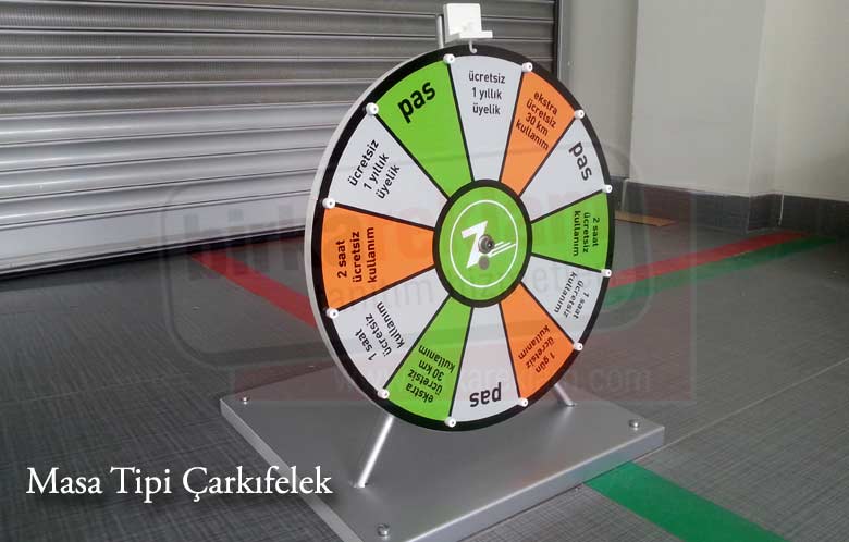 İstediğiniz model de, renkte, ölçüde Çarkıfelek üretimi yapmaktayız. Firmanıza uygun çarkıfelek tasarımını yaptıktan sonra, üretime geçilmektedir. Masa Üstü Çarkıfelek Modellerinden çark çapı 3mt’ye çıkabilen çarkıfelekler üretmekteyiz. Çarkıfelek ihtiyaçlarınız için Müşteri temsilcilerimizle irtibata geçiniz.